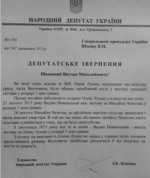 «Еще по Лукаш. Прошу обеспечить ей охрану. В свое время тот же Новинский внес те же 5 млн за Чечетова …», — написал нардеп на своей странице в Фейсбук.