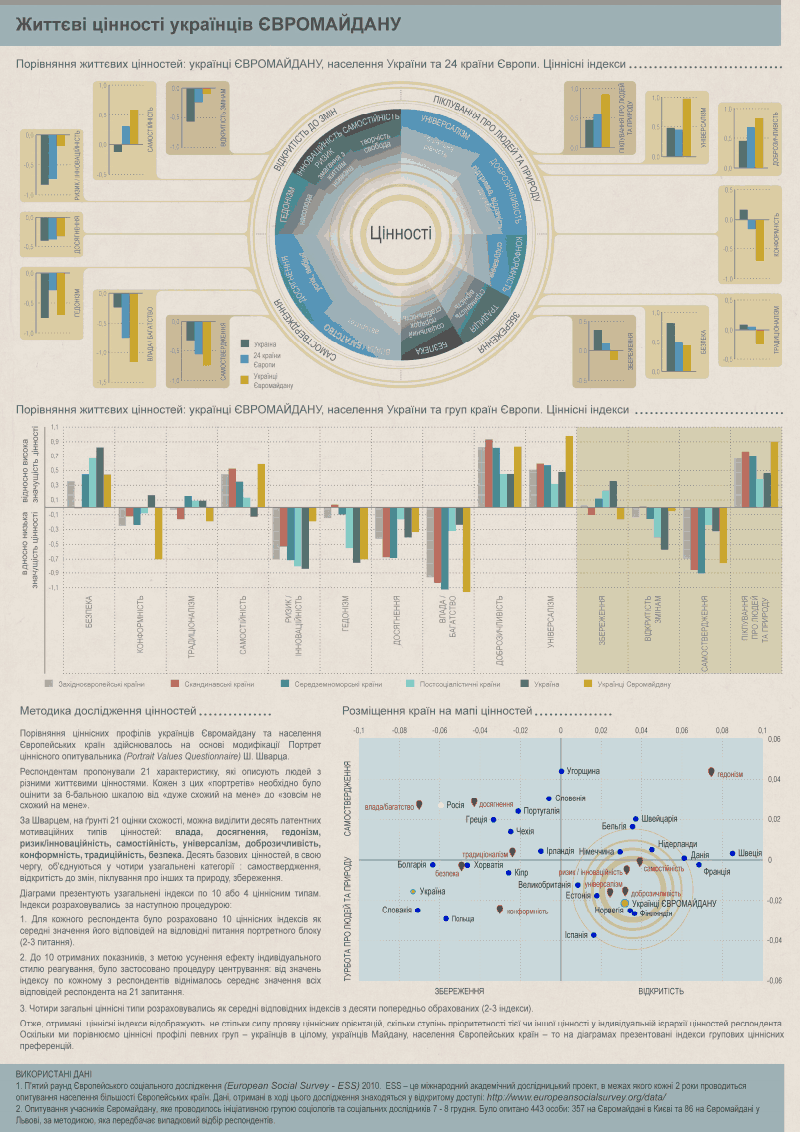 Висновки про саме такий перелік цінностей дозволяють зробити окремі дослідження, зокрема: від Ініціативи «21 листопада», Українського Католицького Університету, Texty, Української правди та інші дослідження.