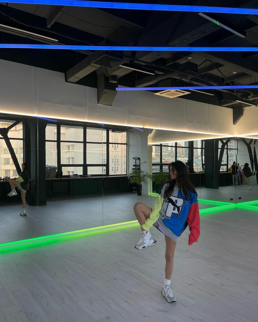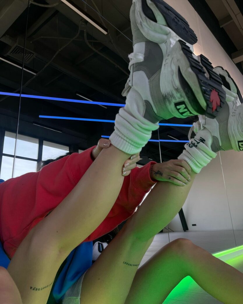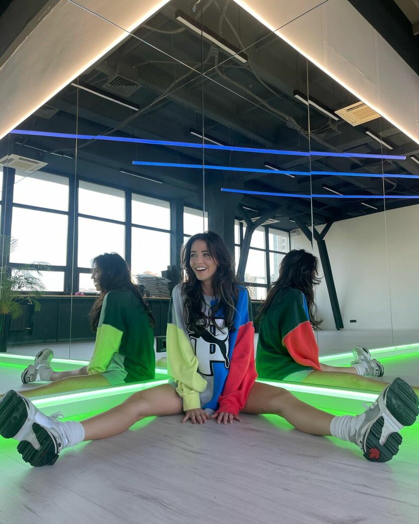 Отметим, что публикацию она дополнила яркими фото с тренировки на растяжку. На Наде как всегда стильный наряд – яркая, разноцветная удлиненная толстовка оверсайз и кроссовки.