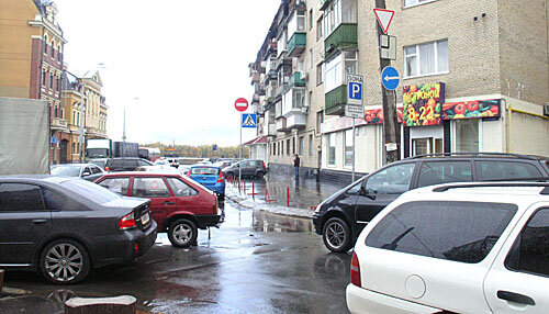 Более того, предназначенная для объезда, ул. Андреевская – довольно узкая, и в ее начале по обеим сторонам припаркованы машины – не протолкнуться.