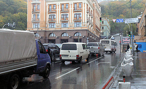 Здесь произошли, пожалуй, самые кардинальные изменения: запретили поворот налево! Движение возможно только прямо – в сторону Крещатика. Обратите внимание — сколько водителей мигают левыми поворотниками.