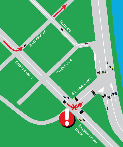 Теперь с ул. Сагайдачного нельзя повернуть через Боричев спуск на Набережную — поворот перенесен на ул. Андреевскую: