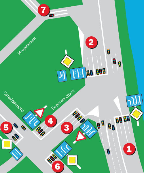 Информация о новой схеме движения (до нашей статьи) была практически не раскрыта — поэтому не только водители не знали об изменениях, но и сами сотрудники ГАИ: на ул. Сагайдачного я попросил инспекторов разъяснить мне каким образом можно проехать на Набережную, на что мне посоветовали повернуть налево на светофоре (см. выше – въезд 5).