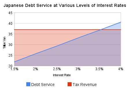 Очевидно, что Япония попала в безвыходное положение. Ослабление йены в сочетании с демографическим кошмаром уменьшит спрос на облигации с доходностью в один процент. А это не позитивная новость для правительства имеющего дефицит в 600 миллиардов долларов ежегодно, и отчаянно нуждающегося в инвесторах для размещения своего долга. Когда спрос на ваш долг слаб, логическим следующим шагом является повышение ставок. Звучит разумно, но не в том случае, если  вы уже должны 10 триллионов долларов. Сейчас процентные ставки на 10 летние японские государственные облигации находятся в районе 0.5 процента. Но даже при этих необычайно низких ставках обслуживание долга уже поглощает 59 процентов всех налоговых поступлений Японии.